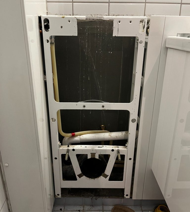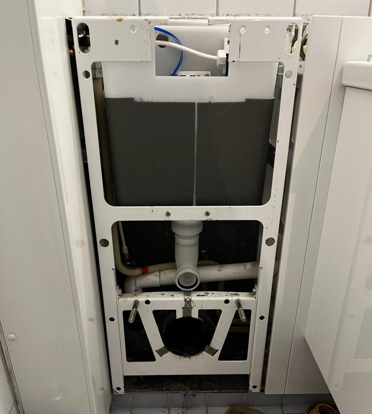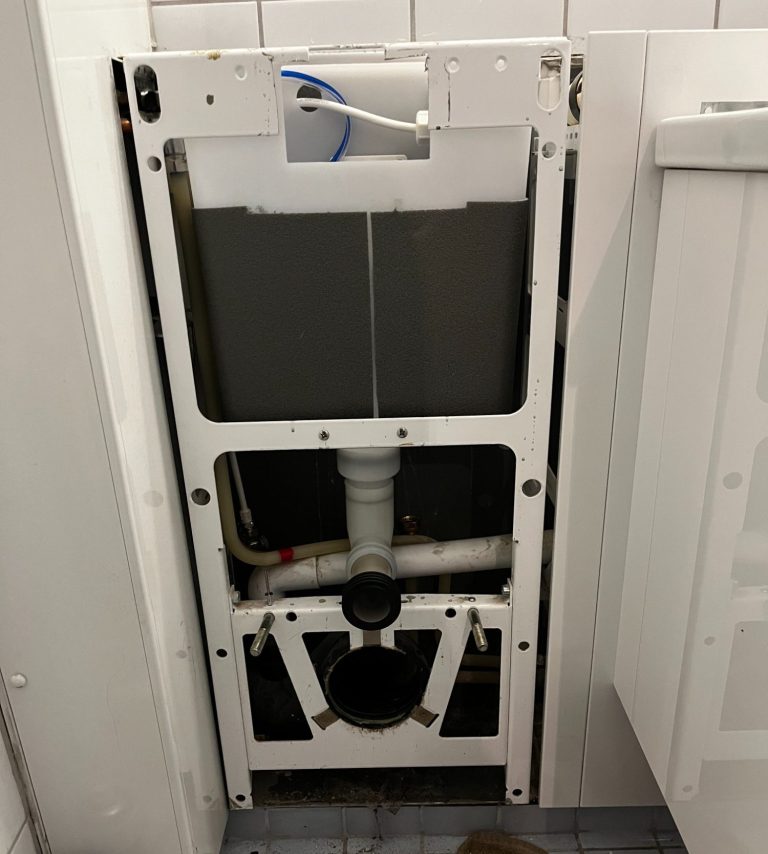 Cisternen kopplas bort från vattnet. Spolröret demonteras. Befintlig upphängningsplåt under cisternen tas bort.