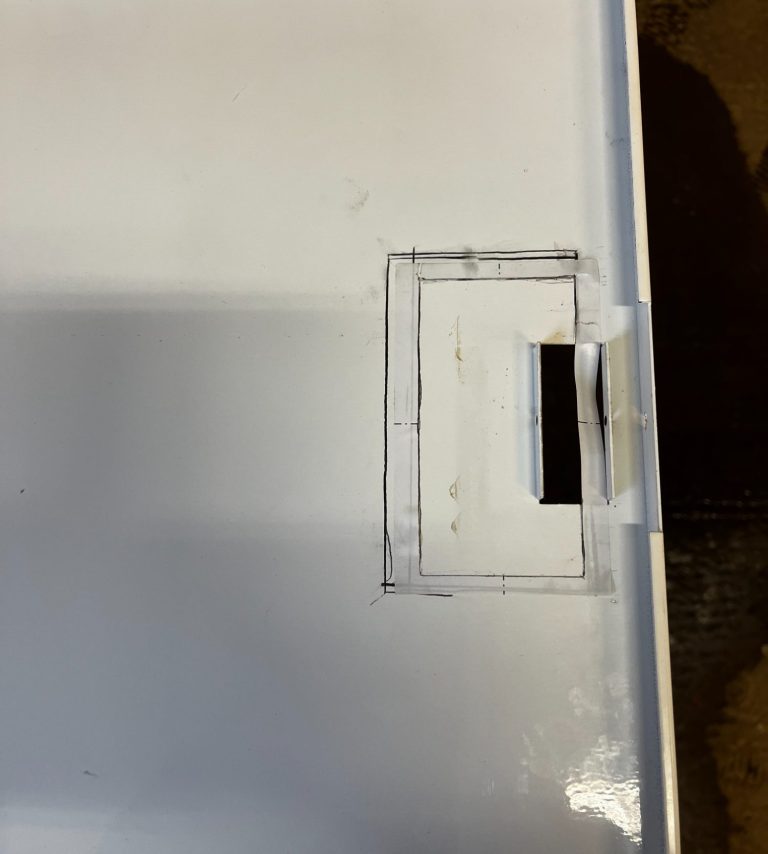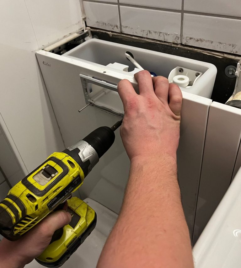 Mått tas för ursågning i övre rambalken där spolknappen ska sitta, man använder cisternen som mall för hur stort hålet ska vara.